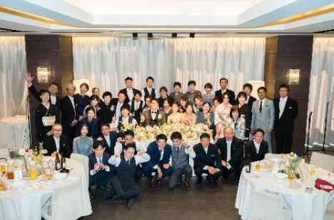 メインの席に座るおふたりの元にゲストの皆さまがテーブルナンバーごとにおふたりとお写真を撮ったり、おふたりがそれぞれのテーブルを回ってお写真を撮ったりすることが多い撮影タイム。おふたりは大切なゲストの皆と写真を撮りたいということで、ご家族様・ご親族様・ご友人がおふたりの元に移動し、ご参列した皆さまで集合写真を撮影しました。