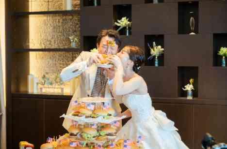 ご披露宴中の演出としてよく知られるケーキバイト。ハネムーンでアメリカに行くほど、アメリカが好きなおふたりは、ケーキバイトではなくハンバーガーバイトを実施。お好みでケチャップとマスタードで味付けをし、最後はバンズで蓋をして、おふたりで仲良く豪快にハンバーガーにかぶりつきました。あまりない演出にゲストの皆様も大盛り上がり。おふたりらしさ全開の演出になりました。