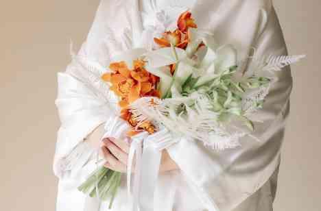 新婦様が当日まで新郎様に内緒で準備したこだわり満点のブーケ。 白無垢にぴったりなクラッチブーケには、さりげなくワンポイントカラーのオレンジが加えられドレスにも映える素敵なデザインでした。 またお2人はご結婚式が結んだ後にこちらのブーケを押し花にされ、形として残る世界に一つだけの特別な宝物を作られました。