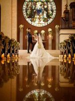 扉を開けた瞬間、誰もが息をのむ圧巻のスケール。正面のステンドグラスとふたりの姿は、大理石のバージンロードに美しく輝き反射する…