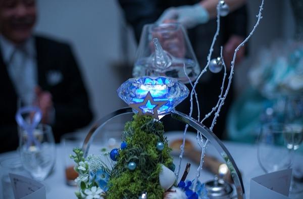 お色直し入場の際、各テーブルへ幻想的な光の演出を。 お2人の大好きな青色、または白色に光る演出を行われました。 ゲストの皆様にも驚きと喜びを感じて頂けるものでした!