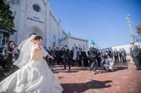 アフターセレモニーでは、始球式&バッティングトスを行いました。さすが現役審判員!新郎様の「ストライク!」がとても印象的でした。 新郎様・新婦様の息のあったバッティングトスもお見事! ドキドキ・ワクワク…周りで見守るゲスト様からも大きな歓声が上がり、チームワークの良さを感じるお二人らしいセレモニーでした。