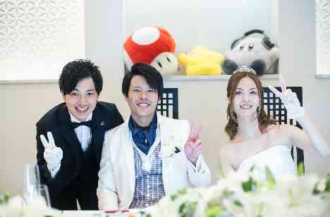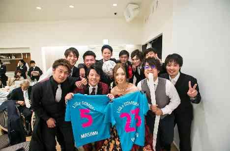 列席してくれたゲストたちとわいわい楽しい披露宴となりました。 会場のいろんなところから笑いが聞こえてくる、 そんな印象でした!! 雅巳さんの友人余興もとても盛り上がりましたね!! お写真は余興の方たちとの1枚!