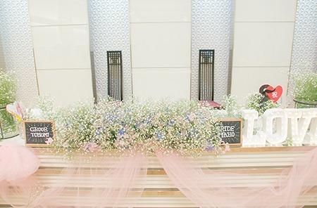 会場内はかすみ草で統一され、かわいらしい雰囲気に♪これも全てお二人がこだわってフローリストと何度も打ち合わせをして作り上げた会場。メイン席は新婦様こだわりの“LOVE”のマーキーライトやミニ黒板で装飾♪