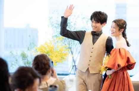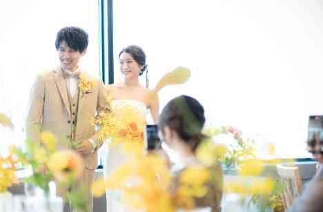 イエロー色のオンジジュームのブーケが鮮やかに華やぐドレススタイル。お二人が選ばれた挙式スタイルはゲストの皆様との距離がより近い、カジュアルでアットホームな宴内人前式。海外のウェディングパーティのような雰囲気で誓いのハグやサンドセレモニーなどお二人らしさを詰め込んで。見守る皆様もほっこりと、至高の幸せが会場いっぱいに広がるとても愛らしい誓いの時間となりました。