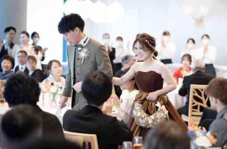 ブーケ当てクイズを交えたお色直しはブラウンのシフォンドレスと可憐なラウンドブーケでご登場。テーブルラウンドやフォトタイムでおひとりおひとりとの時間も大切に、感謝をお伝えしながらたくさんの思い出を紡ぎます。全員で一緒に盛り上がりたいとお二人が企画された食べ比べゲームは、大人の本気モードでパーティの盛り上がり最高潮に。