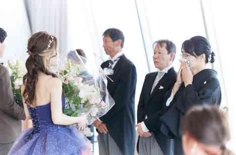 お二人のこだわりのBGMを流しながら心の距離近く、ゲストの皆様との時間を存分に楽しむパーティは歓談をメインに。大切な思い出を込めたエピソードレシピは、自然と会話も弾むメニューで楽しい美食時間をプレゼント。眩い輝きのネイビードレスで迎えた親御様へ贈る感謝の時間は、親御様の思い出のお花を添えた花束にお二人のお気持ちも束ねて。