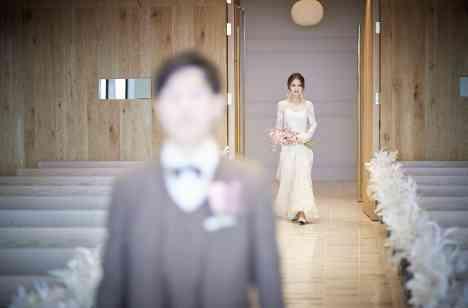 ウェディングドレスは新郎様ご希望のデザイン。バージンロードに優しく響き渡る新婦様の歩みに、馳せる想いはどんどん高まります。ドレスに包まれた新婦様とのご対面は、歓喜と笑顔がいつまでもとまらない生涯の記憶に残る瞬間に。お二人だけの静かなチャペルで、改めてお互いの気持ちをひとつに新しい未来へとあゆまれます。