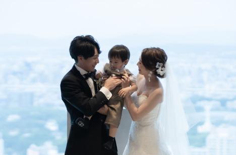 愛息子様と迎えた誓いの日は、家族三人のはじまりのお披露目を。そして大切な皆様をお招きして、これまで過ごしてきた日々や思い出を一緒に振り返りながら、お二人らしく感謝をお伝えする時間に。コーラルピンクとオレンジのあたたかく優雅なコーディネート空間でたくさん笑い、心豊かに過ごすファミリーウェディングをご紹介します。