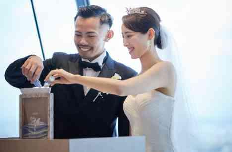 ラインの曲線美が際立つアシンメトリーデザインの華麗なマーメイドドレスとブラックのタキシード、特別な装いは結婚式への実感を一歩一歩高めてくれます。扉が開いた瞬間のゲストからの祝福の声にリラックスした表情のおふたり。ゲストの皆様の想いで、美しいマリンカラーに染まるサンドセレモニーが完成します。たくさんの喜びと祝福が巡る煌くバブルシャワーの門出から新たな未来へと出発です。