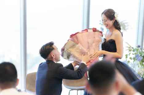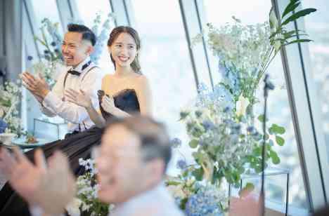 ブルー×ホワイトの装飾はお二人の大好きな海をイメージする最上階のリゾート風コーディネート。デルフィニウムや紫陽花の清涼感に胡蝶蘭・カラーの上質さをプラスした爽やかなサマーウェディングに。パーティーの結びには新郎様からのサプライズが。いつも記念日を大切にするお二人だからこその愛情あふれる大輪のバラの花束が輝き、会場全体が感動に包まれます。