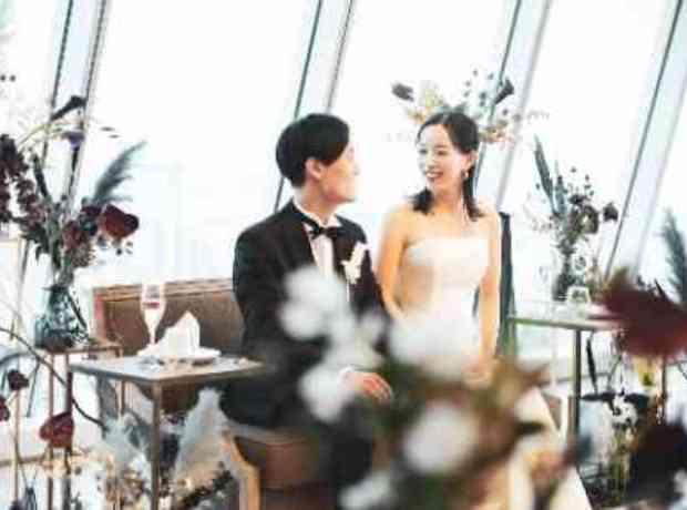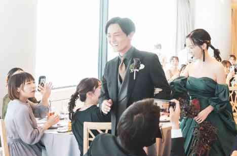 パノラマビューは心を開放的に、ご友人のスピーチや歓談・フォトタイムは笑顔あふれるアットホームな時間。ディープグリーンのボリュームドレスで華やかなお色直しのお披露目をされた後は、お二人ご希望の食べ比べゲームを。全員で楽しむことができる企画として、また大人の本気が垣間見えるユーモアさも魅力的な大人気の演出です。ゲームを通してゲスト同士の交流も深まり、さらに一体感ある特別な一日に。