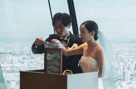 朗らかな笑顔でご入場されたお二人は、ジャケットセレモニー・ベールダウンと親御様にお支度を整えていただき、深い愛情に導かれて門出のときを迎えられます。祭壇に立つお二人のバックに広がるスカイビューは生涯に一度の特別な瞬間を印象的に彩る演出に。お二人の言葉でお伝えする宣誓、可愛いリングガールのご登場と和やかな雰囲気の中、最後はフラワーシャワーの祝福を浴びて未来へとあゆまれます。