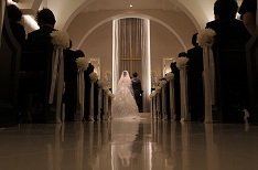 新婦様の入場時、お父様だけではなく、お母様にも一緒にご入場していただきました。そして、お母様にはベールダウンのセレモニーを行っていただきました。花嫁のベールをおろすということは、今まで愛情いっぱいに子育てされてきたいお母様の最後の役目とも言われています。その短い間に生まれてから今までのことがよみがえったことと思います。そして、ご新婦様はご新郎様のもとへとバージンロードを進まれました。