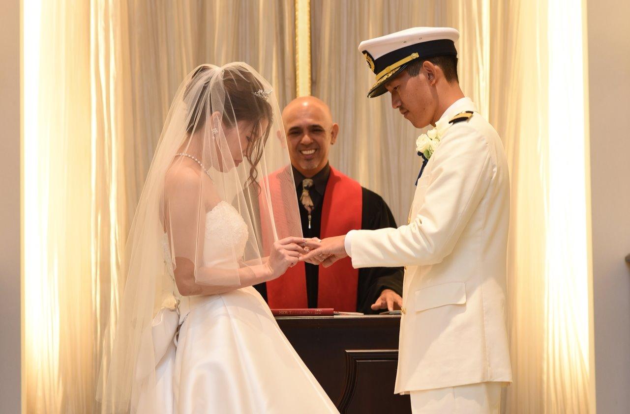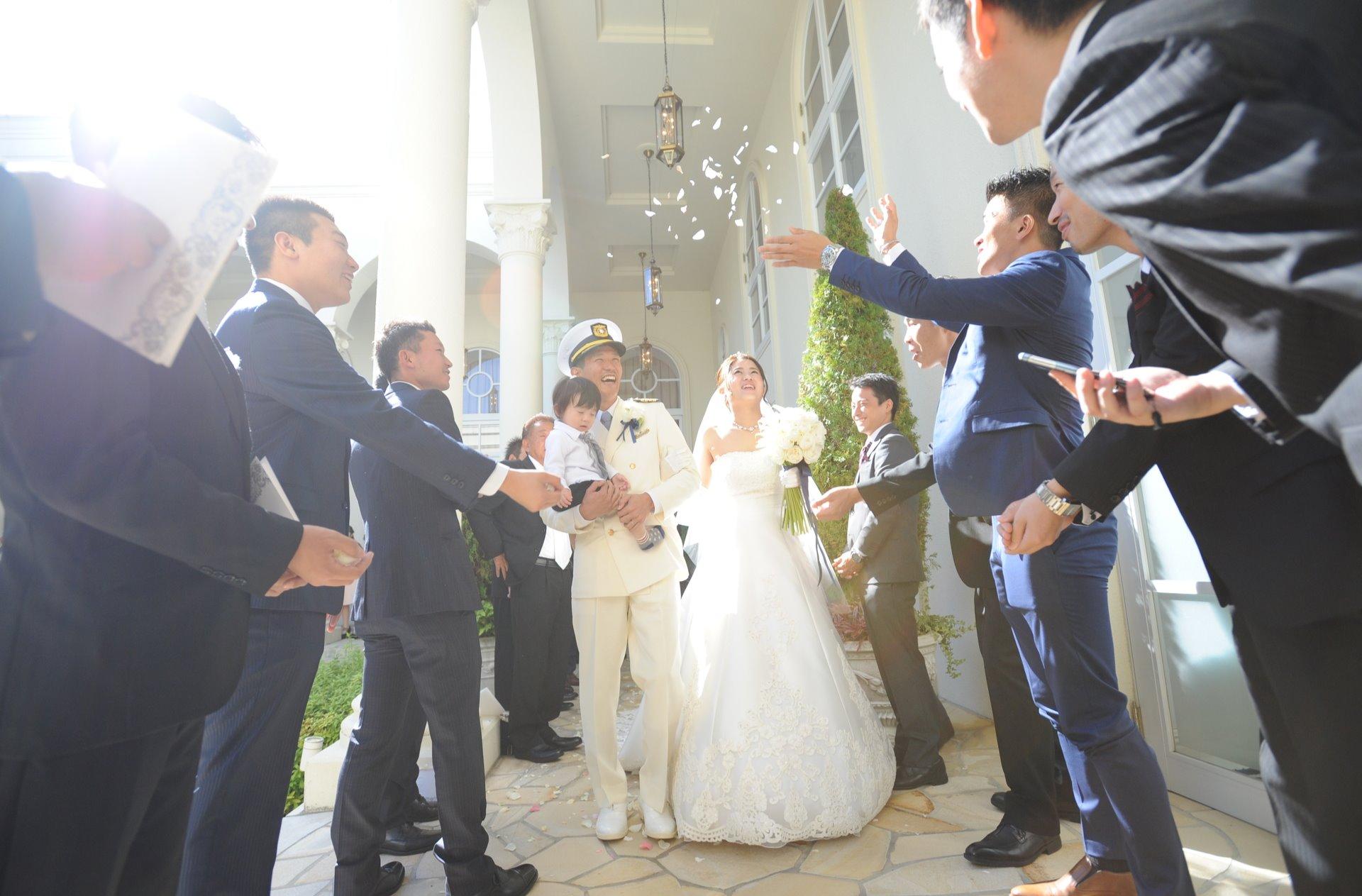 海上保安官のご新郎様だった為、儀礼服を着用し行いました。 ご新郎様の憧れだった映画のワンシーンのような挙式となりました。 善心も一緒に登場し、ゲストの表情も一段と明るく和やかな時間でした。 大切に育ててくださった新婦お母様からのベールダウンのシーンも大変感動的でした。