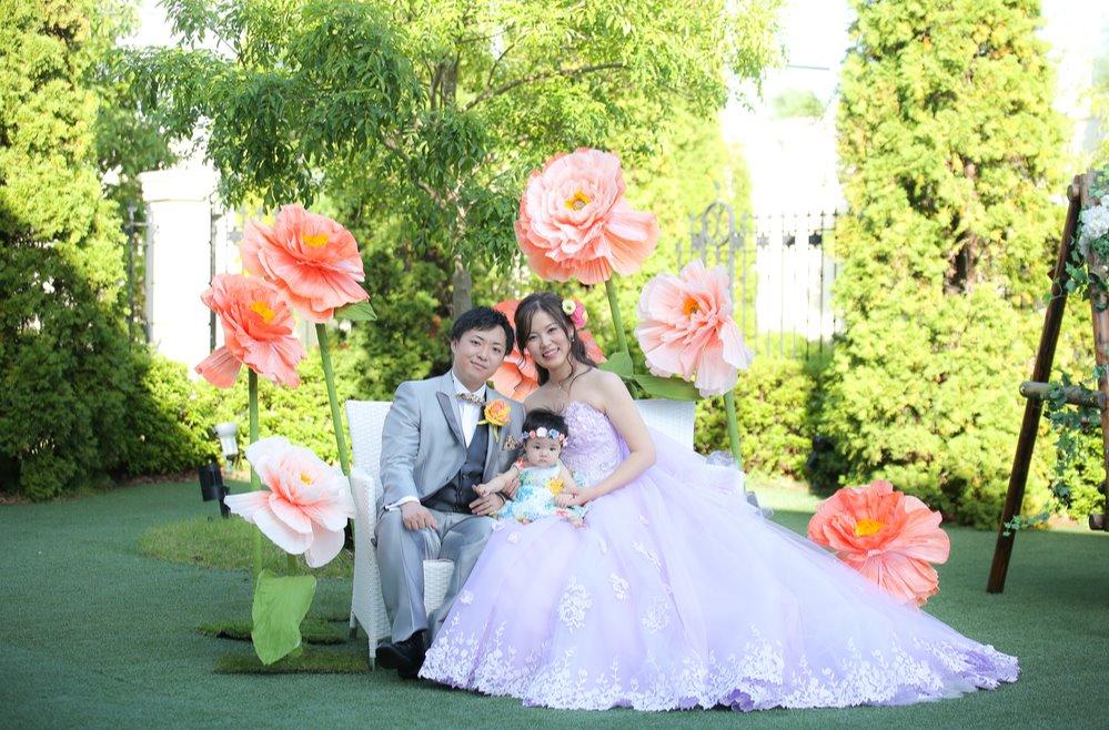 既にご親族のみで挙式済まされていた為、ガーデンセレモニーのお時間を作りました。 大好きなゲストの皆様とプール付貸切ガーデンでのフォトタイムはたくさんの笑顔が咲きます。 ご新婦様お気に入りのジャンボフラワーのフォトスポットも装飾しました。