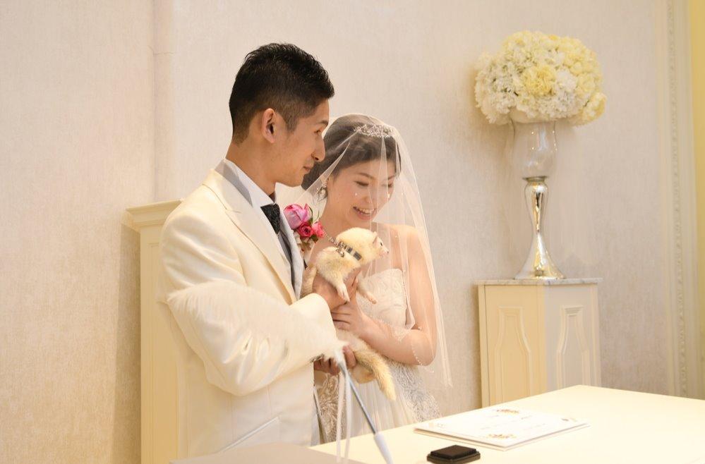 お二人の大切なペット、フェレットのヴェレくんも挙式にご参加いただきました。 立会人代表としてご登場いただき、結婚証明書へ署名代わりに捺印のサインを♪ 家族の繋がりを感じることができた、アットホームな挙式となりました。