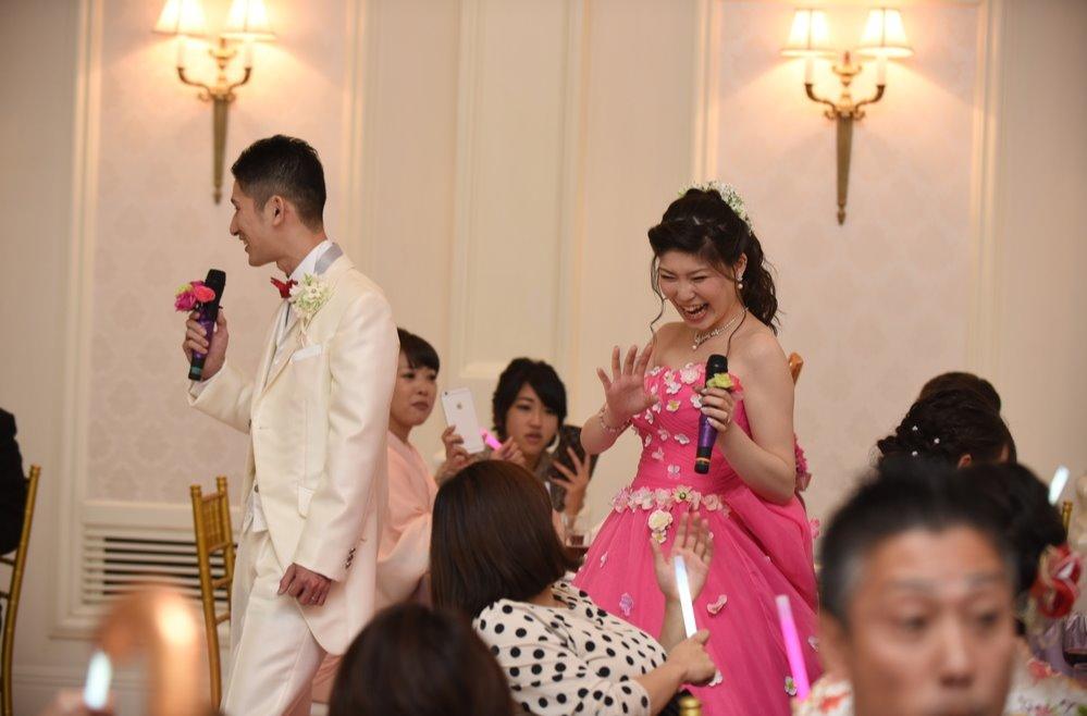 お色直しのご入場はなんとお二人が歌いながらのご入場。 ゲストの皆様にペンライトをお持ちいただき、ライブのような雰囲気となりました。 その他にも、ご新郎様に秘密でファーストバイト用の大きなスプーンをご用意したり ご新婦様に秘密でバースデーサプライズを行ったりご新郎ご新婦様に秘密でお二人のお好きなアーティストをを手配したりと皆様に「わ~」と驚いて頂けるようご準備を進めていきました。