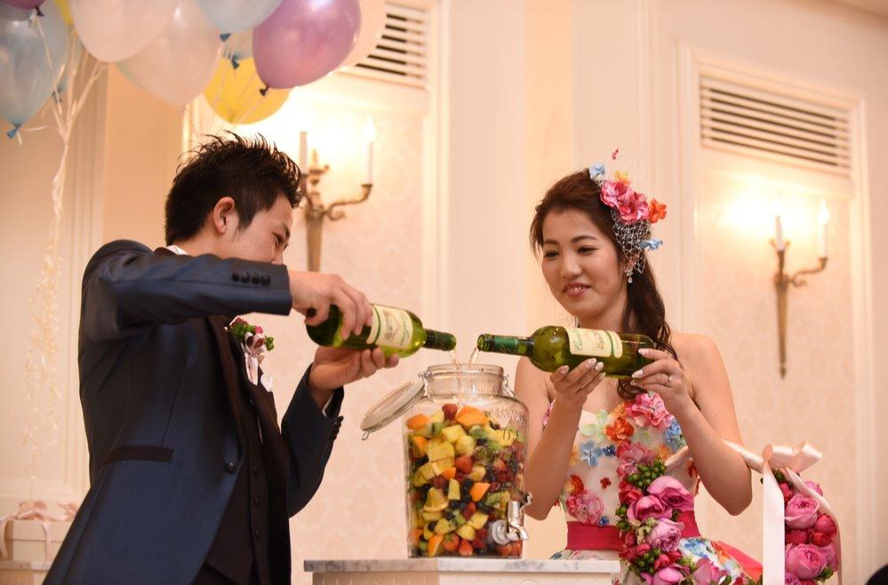 素敵なお写真が残り、斬新でゲストの皆様とお話ができるような演出がご希望でしたので「果実酒ラウンド」を行いました。 ゲストの皆様のテーブルを回りフルーツを集めるシーンでは、沢山のお写真やお話を楽しんでいただけました。 デザートのタイミングでは皆様果実酒を手に、デザートタイムをお楽しみいただきました♪