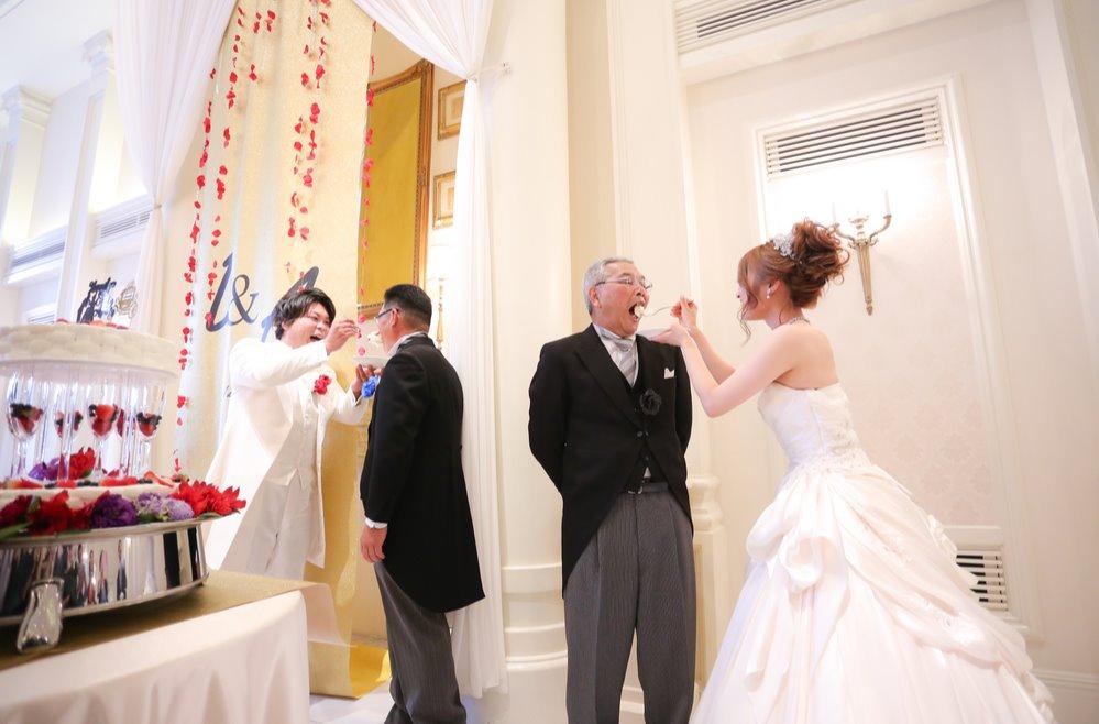 サプライズで両家のお父様をお呼び出しし お互いのお父様に向けて、ケーキをバイトしていただきました。