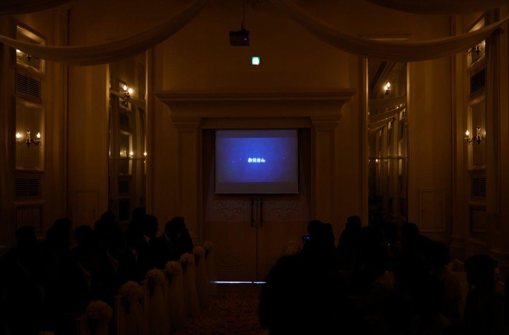 新婦入場の前にはバージンロードの意味をお伝えする、チャペルムービーを上映しました。一緒にバージンロードを歩くお父様はもちろん、その他のご親族様やご友人の皆様へも意味が伝わりとても感動的な雰囲気の中挙式がスタートしました。