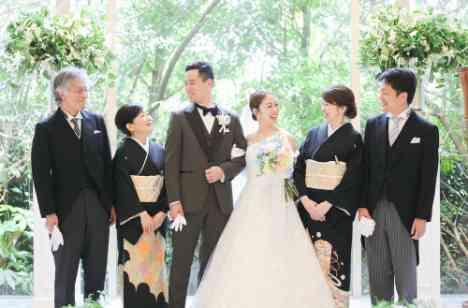 両家の親御様にお支度が出来上がって初めて晴れ姿をお見せしました。自然光差し込む、緑いっぱいのチャペルで木々たちを背景に記念写真を撮影しました。お二人と親御様の表情からとても喜ばれていることが伝わってきて、素敵な時間になりました。当日は全館貸切となるため、ファミリーミートにもしっかり時間が取れて親御様ともたくさんのお写真を残すことができます。
