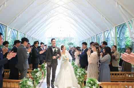 白を基調とした緑いっぱいの挙式会場。たくさんの祝福の拍手の中退場をされているシーンです。普段は遠方にお住まいのお二人。職場の皆様、久々に集まられた地元のご友人様、ご親族様と笑顔溢れる暖かい時間を過ごされました。人前式だったので、新郎家ご両親様が作成されたオリジナル結婚証明書もよりお二人らしさが際立たせてくれたアイテムです。