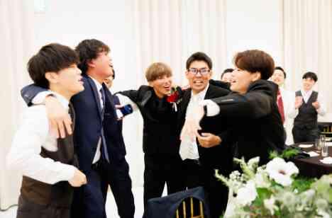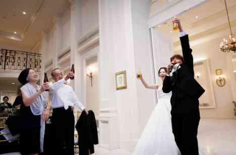 挙式からとにかく楽しく思いを伝えてきたお二人 披露宴はより楽しくアットホームにすごすため乾杯はお二人が入場をした瞬間 ゲストの方からではなくお二人が行いました シャンパンではなくおしゃれなボトルドリンクで行い お二人はそれぞれのゲストの皆様の間を乾杯をしながら入場! 最高に盛り上がる楽しい入場の時間になりました