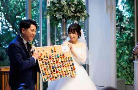 挙式では、おふたりが一つ一つご準備した手作りレゴブロック結婚証明書でゲストに結婚の証明を残していただきました。ゲストの皆様にも受付で好きなレゴブロックを選んでいただきながらご参加いただく世界の一つの結婚証明書になっており、ゲストから「どれにしよう~?」と挙式前より楽しげな声がロビーからたくさん聞こえてきました。