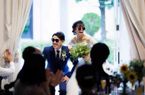 披露宴最初のご入場では、オープニングDVDの曲をそのまま使用しながらスタイリッシュにガーデンよりご入場いたしました。使用した曲は流行りの洋楽を取り入れ、よりゲストの皆様のボルテージも上がってまいりました。そんな中おふたりは前撮りで使用したサングラスをかけて、より盛り上がりに合わせてかっこよくご入場いただきました。