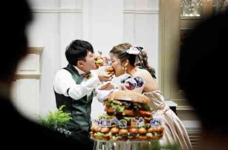 キャンプが好きなおふたり。アウトドアを感じていただけるようにハンバーガーセレモニーをすることに!トップの旗をおふたりで刺し完成へ。お互い手でバイトし、より迫力を感じていただけるようにしました。このジャンキーなハンバーガーをご兄弟にも豪快に手でおすそ分け!迫力ある演出に会場内大盛り上がりを見せました。