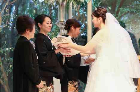 本来だったら披露宴の際に行う親御様へのお手紙朗読と記念品贈呈を挙式時に行う。おふたりがこだわったポイントは、「大切なご家族に感謝の気持ちをしっかりと伝えたい、そしてそれをエンドロールムービーに残したい」という想いでした。おふたりの「エンドロールムービーに残せたらな…」という心の内をお伝えくださったからできたシーンでした。お手紙を読みながらおふたりも親御様もゲストの皆様も涙に溢れるお時間でした。