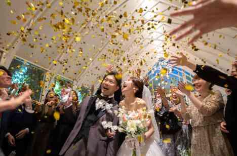 アットホームながらも和やかな挙式の結びには、おふたりをゲストの皆様に囲ってもらい、一斉にフラワーシャワーをして頂きました。中でもこだわったのは、投げて頂くコンフェッティーを大粒の物にし、より写真にも迫力が出るようにしています。そのかいあってお写真にもとてもきれいに残すことができ、ゲストの皆様にとっても印象的なシーンとなりました。