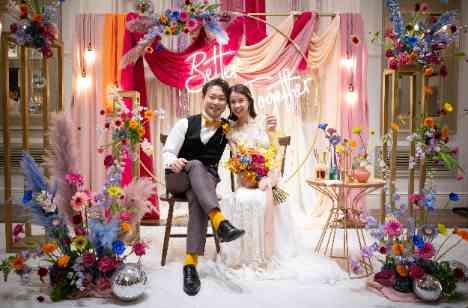 結婚式当日は11月16日で「イイイロの日」でした。そんなおふたりへ鮮やかなカラフルなイメージをご提案させていただきました。おふたりが過ごすメインテーブルは、様々なお色味を使い、カラフルな印象にしつつ、電飾をプラスしてより華やかな印象で作成致しました。お手元のブーケもそれに合わせて2つのウェディングドレスに生えるようカラフルな色味を使用致しました。