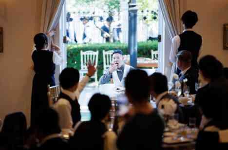 お二人がとっても楽しみにしていた進行の一つ デザートビュッフェのお時間 甘いものに目がない新郎様がゲストの皆様より誰より先に食べてしまっているというおちゃめな演出♡ カーテンが開くと大好きなスーツをほうばるご新郎様のお姿にゲストの皆様からも笑いが起きていました デザートビュッフェにはお二人の大好きなティラミスとイチゴをふんだんに使用しガーデンでゲストの皆様と和やかな時間を過ごしました