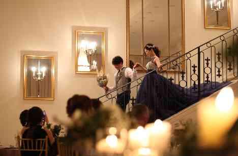 入場口が沢山あるからこそ、入場口を秘密にしてサプライズ感ある入場を行いました。 階段から新郎新婦がご入場した瞬間、沢山の歓声が上がり盛り上がるシーンとなりました。 また2階から入場することでどこに座っているゲストからでもお二人の写真を残すことができました。