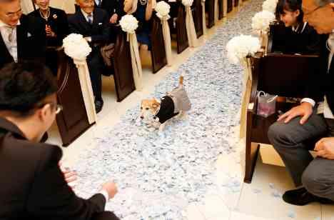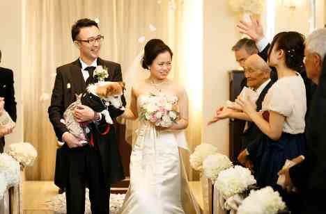 挙式には愛犬あきくんの力をたくさん借りました。 お二人のファーストミートの際には、お二人の緊張をほぐし、 指輪交換の際にはリングドッグとして、見事指輪を届けることに成功しました。 また、誓いの言葉を宣誓した後にはゲストを代表し、証人としてあきくんの手形を証明書にスタンプしました。 ゲストも自然と笑顔になり、温かい歓声が上がるほどでした。