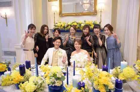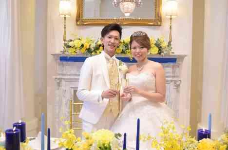 ご披露宴会場はイエローとブルーに染め上げることで統一感のある会場にすることができました!ゲストもお二人に色に染められた会場に足を運んだ瞬間、歓声をあげていらっしゃしました!シャンデリアや大階段に囲まれた雰囲気の中、どこもフォトスポットになっていました!