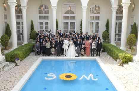 挙式はしっかりと誓い、みんなに見守ってもらい、その後はとにかくラフに楽しい雰囲気に。 ガーデンでのセレモニーは大きなクラッカーを抱えて登場したり、ゲストの皆様と笑顔いっぱいの時間を過ごしました! 貸切のガーデンのプールにはお二人の大好きなひまわりを浮かべました。