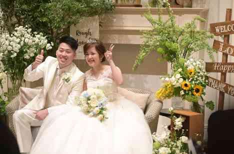 おふたりのお席やゲストのお席、ブーケなどにおふたりの大好きなひまわりを飾りました。 ソファのお席でゲストとの距離も近く、皆様とのフォトスポットになり、たくさんの笑顔のお写真を残すことができました。 また、おふたりのテーマのロゴを入れたタペストリーもお飾りして、ゲストの皆様へもおふたりの結婚式への想いが伝わるようにしました!