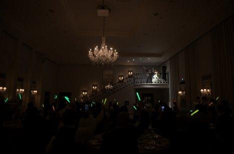 披露宴のお色直し入場はとにかく楽しく。 ゲストの皆様にペンライトをお配りして、お席を自由に立っていただき、 おふたりとハイタッチをしながらご入場。特にご友人の皆様が会場を盛り上げてくださり、とても素敵なシーンでした。
