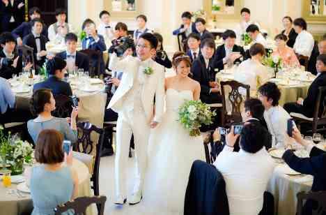 入場時新郎目線の撮影もご提案し、入場しながら撮影をするというお二人らしいシーンをつくることができました。たくさんの写真を残したいとご希望でしたので、ゆったりした進行にし、とにかくゲストとたくさん会話し、写真を残す時間をおつくりしました。 お色直し入場では、新郎はゲストからブーケを集めながらご入場されました。