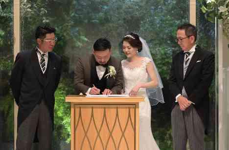 お二人の結婚式ではありますが、お打合せではご招待するゲスト様のこともたくさんお伺いします。それは、お二人がどんな結婚式をしたいのかを考える為に、一番大切なことかもしれません。 お二人からはご家族のお話が一番多く、温かい家族に囲まれ今のお二人が育まれたのだろうなととても感じました。その為、挙式の際ゲストを代表しお父様に承認のサインをサプライズでして頂きました。
