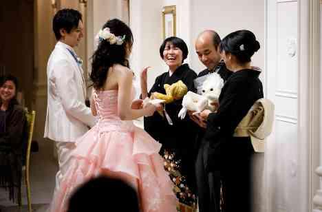 新婦様よりお手紙を朗読し、親御様の元へ記念のお品をお贈りするシーン。 生まれた時と同じ体重でつくられたウェイトドールをプレゼントしました。 涙なみだのシーンになるかと思いましたが、ご両家ともに笑顔いっぱいのシーンに。 お二人とご家族の色がとても滲み出ており、温かい気持ちになりました。