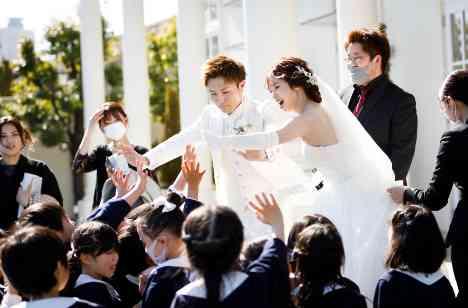 幼稚園の先生をされている新婦様。愛してやまないかわいい園児たちがお祝いに駆けつけてくれました。こういう時期だからこそ、検温・体調チェック・マスク着用・除菌はしっかり忘れずに行いました。園児たちの目はキラキラしていて、新婦様は普段園児たちに愛情をいっぱい注いでいるんだろうなと想像できました。新婦様もこの時だけは完全に先生の顔でした♡