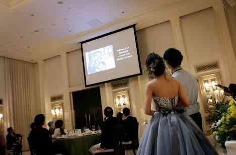 プランナーがお打ち合わせをする中で、必ず家族についてお伺いを致します。今まで守り、支え、育ててくれた親御様へ感謝を伝えたい。これはお二人が共通しておっしゃっていました。ただ、あらたまってみんなの前でお手紙を読むのは照れてしまう・・・でも映像だったら素直な想いを昔の写真に乗せて伝えられるかもしれないですね。会場全体が温かな雰囲気になりました!