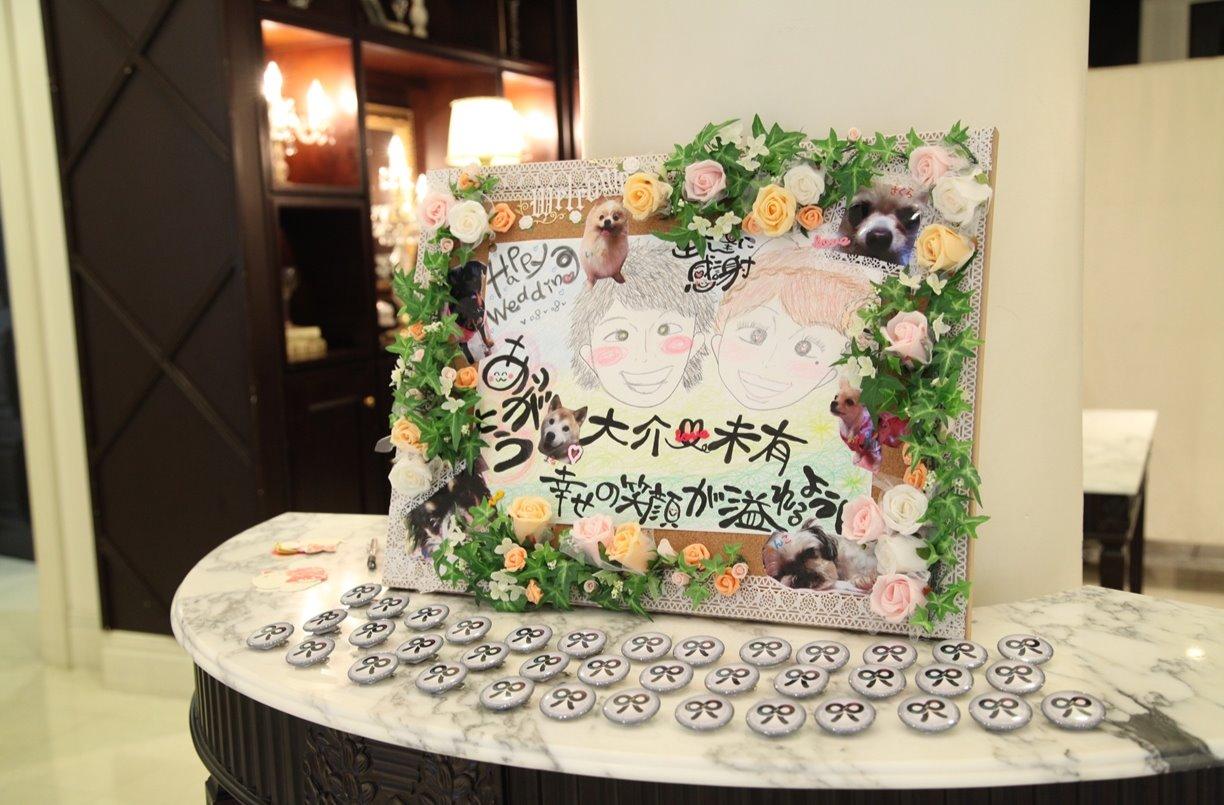 挙式前に全員にオリジナルロゴ入り缶バッチを付けてもらいました