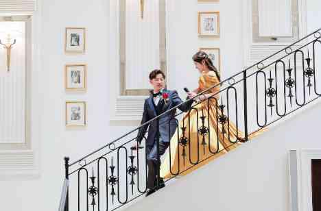 装飾も衣装も「美女と野獣」に振り切りました。再入場ではふたりで歌いながら入場。新郎新婦それぞれ異なる場所やタイミングで入場し、「めぐりあう」という歌詞に合わせて階段の上でおふたりが巡り合う映画のようなシーンは圧巻。 貸切だからこそ結婚式が結んだ後のフォトシューティングタイムでも、この大階段を使って前撮りのようなお写真もしっかりお残ししました。
