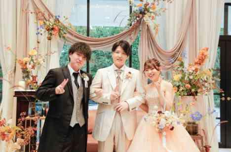 ご新郎様は双子のお兄様がいらっしゃいました。お打ち合わせの際に、双子で入れ替わってるとか人生で一回はやってみたかった~とお話しされていたため、入場で入れ替わりましょう!と提案させていただきました。当日2階から入場されたご新婦様とお兄様にゲストの皆さま誰も気づいておらずでした!後から「ちょっとまった!」とガーデンから入場してきたご新郎様を見て全員がびっくり!サプライズ大成功でした。