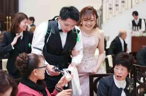 ゲスト皆様に感謝を伝えたいという想いはありましたが、感謝以外にも伝えたい言葉があるのではないかという思いから、ご新郎様からご希望いただいていたビールサーバーを背負ってゲスト1人1人にご挨拶を行いました。楽しそうな表情がとても魅力的です。